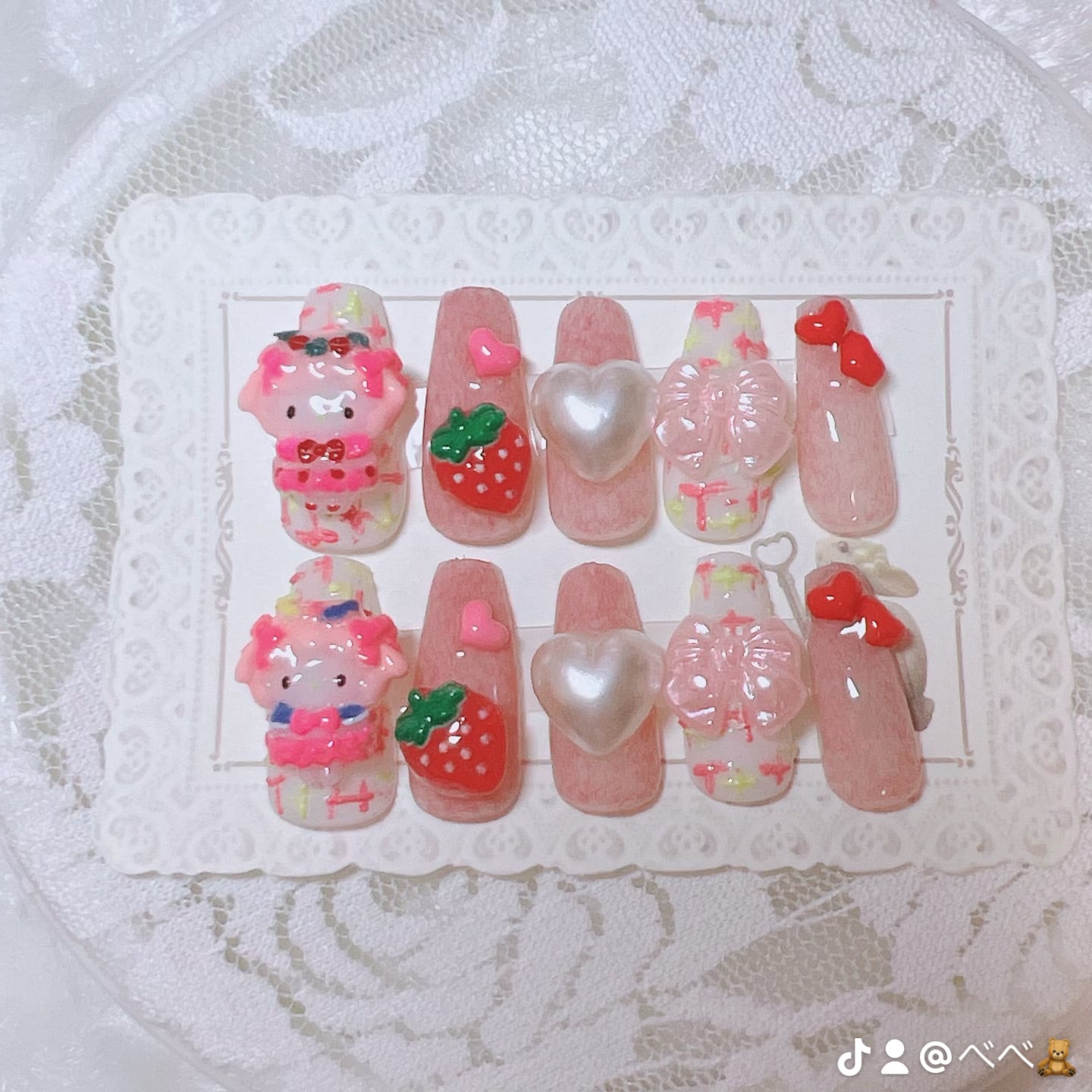 ʚイチゴとウサギの量産型ネイルチップɞ こちらのサイズはショートのバレリーナ型となります。親指から25468です。 〜付属品〜 ♡防水粘着グミ(2回分) ♡スティック ♡爪ヤスリ ※ひとつひとつ手作業の為、まれにほこり等入ってる場合がございます。